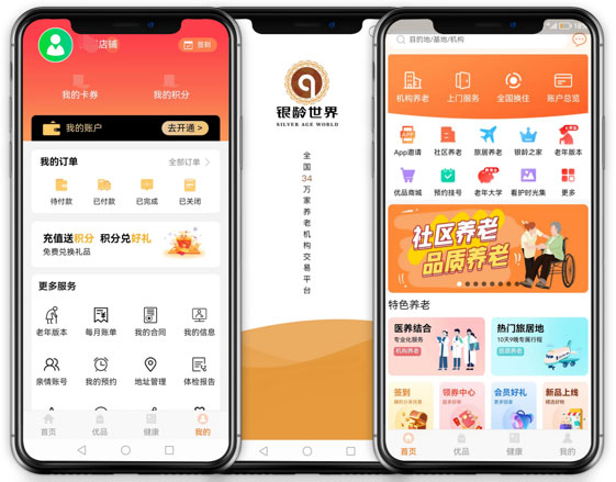 “銀齡世界”平臺以“55~70歲”中老年用戶為中心構(gòu)建“衣、食、住、行、康、養(yǎng)、樂、玩以及到家服務(wù)、優(yōu)品商城、文化藝術(shù)、健康管理”等服務(wù)體系,讓老人只使用一個App就可以滿足晚年生活的日常所需。